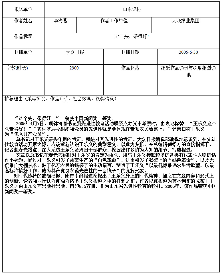 长江韬奋奖参评者获奖作品登记表