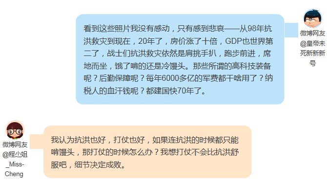该微信号说,央视这条微博发出后,马上引来网友不满,纷纷表示,98年抗洪救灾到现在快20年了,我们抗洪救灾的后勤保障怎么还这水平?↓↓↓