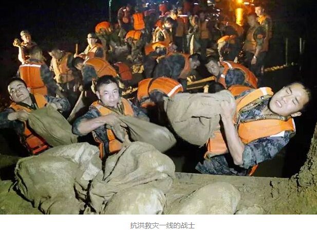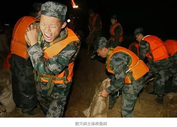 这消息说,“在全国人民关心救灾的之时,央视的一篇微博迅速引起激烈讨论和广泛关注。内容是这样的:‘大雨滂沱里,他们(抗洪官兵)不穿雨衣;为了运沙袋,他们浑身是泥,里外湿透;六十斤的沙袋,他们每个人扛三百个,来回跑六百趟;混着雨水的矿泉水和几个馒头,就是他们日常的伙食……哪里有危险,哪里就有抗洪抢险的战士们。致敬!’”