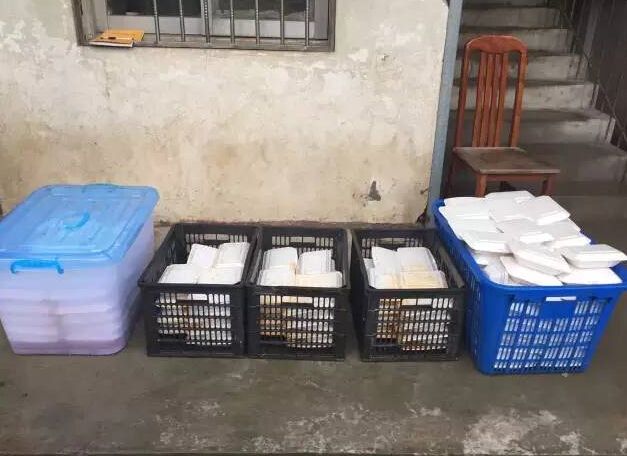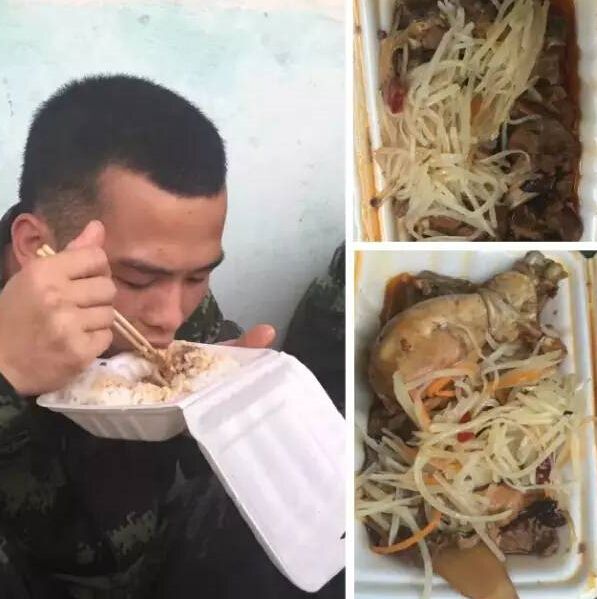 不信你看,这是安徽肥西县三河和铜陵市枞阳县救灾武警战士这两天的伙食,有牛肉和鸡腿。