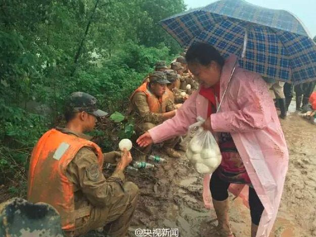 这种时候,老百姓也会发自内心心疼这些战士,下面这位大姐是湖北黄梅县人,看到来不及下堤去镇上吃饭的救灾战士,自发购买了馒头、矿泉水送到了大堤上。而看到战士手脏不愿意拿馒头,甚至把馒头一口一口喂到了战士的嘴里。