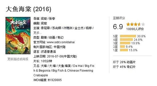 《大鱼海棠》上映后,观众对影片的评价两极分化,豆瓣评分从最早的8.5分逐渐降到6.9分。