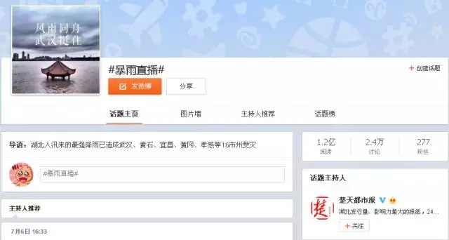 湖北日报传媒集团参与防汛抗灾报道的总人数达369人,截止7月6日,湖北日报、楚天都市报、楚天金报三报推出23个专版报道,其中文字报道100多篇8万多字;各新媒体平台采用图文、视频、H5等报道形式,编发稿件1800多条50余万字;集团全媒体平台24小时实时报道,各平台之间通力合作、紧密互动,形成传播强势,其中楚天都市报官方微博#暴雨直播#栏目总阅读量突破4000万,荆楚网#湖北防汛抗旱#话题总阅读量突破3500万,2260人参与讨论。