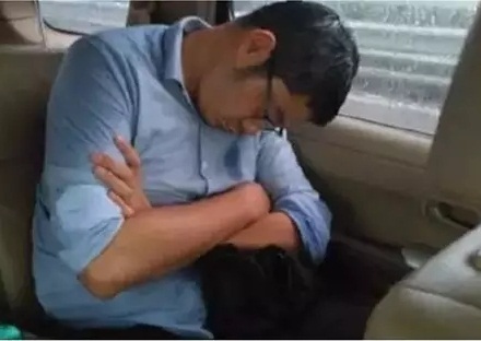 图为湖北电视台综合频道记者在回台交片的车上沉睡