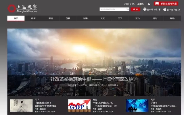 不仅仅是办公场所、团队人数,因应深度融合、整体转型的要求,解放日报的组织架构、采编流程以及考评机制,都做了创新改革。上海观察新架构“孵化”出八十多个栏目,作为上海观察最基本的生产单元。栏目实行主编负责制,主编享有充分的策划权、组织采编权、发稿权、考核权和分配权。报社每隔一段时间会对所有栏目进行评估考核,不合格的将予以淘汰。上海观察首页也重新编排,设置 “头条”“热点”“时政”“深度”四屏,分别强调“重”(中央和市委主要领导相关内容以及国内外重大新闻)、“热”(热门话题、热点新闻)、“政”(党政机关公务员、城市利益相关者关注的政务政策)、“深”(适合深度阅读的精品佳作)的特点,每屏配置三篇稿件,各栏目稿件大珠小珠落玉盘,精华全在首页呈现。