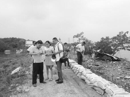 7月10日,《池州日报》记者江志(前排右一)、刘莹(前排中)在池州市贵池区江口街道办事处查村圩采访抗洪抢险情况。唐传信 摄