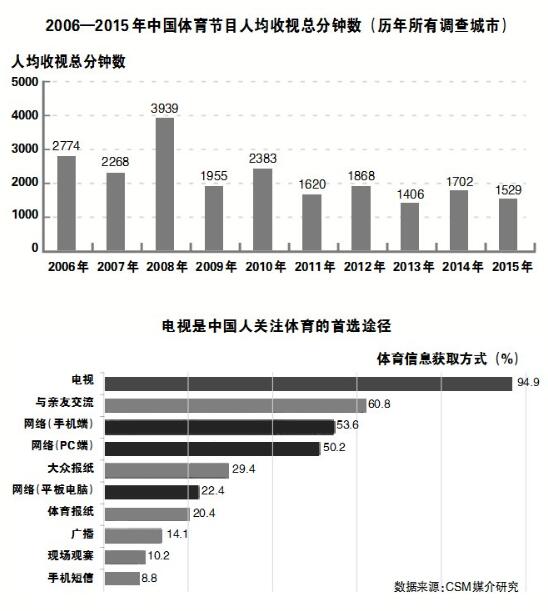 亚洲及中国体育市场发展之快令人瞩目。随着各大国际赛事在亚洲体育市场的关注度日益攀升,亚洲地区体育受众已经成为一股不可忽视的收视人群。数据显示,2015年我国电视观众全年体育节目人均收视时长为1529分钟,相比同样缺少体育大赛支撑的2013年增长了123分钟,涨幅为8.7%。