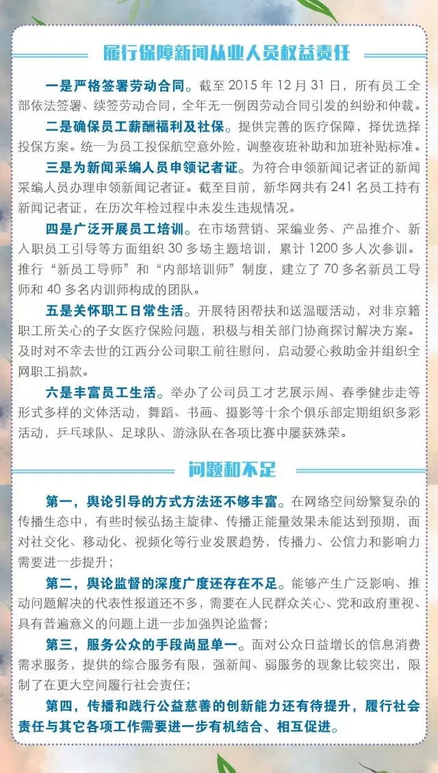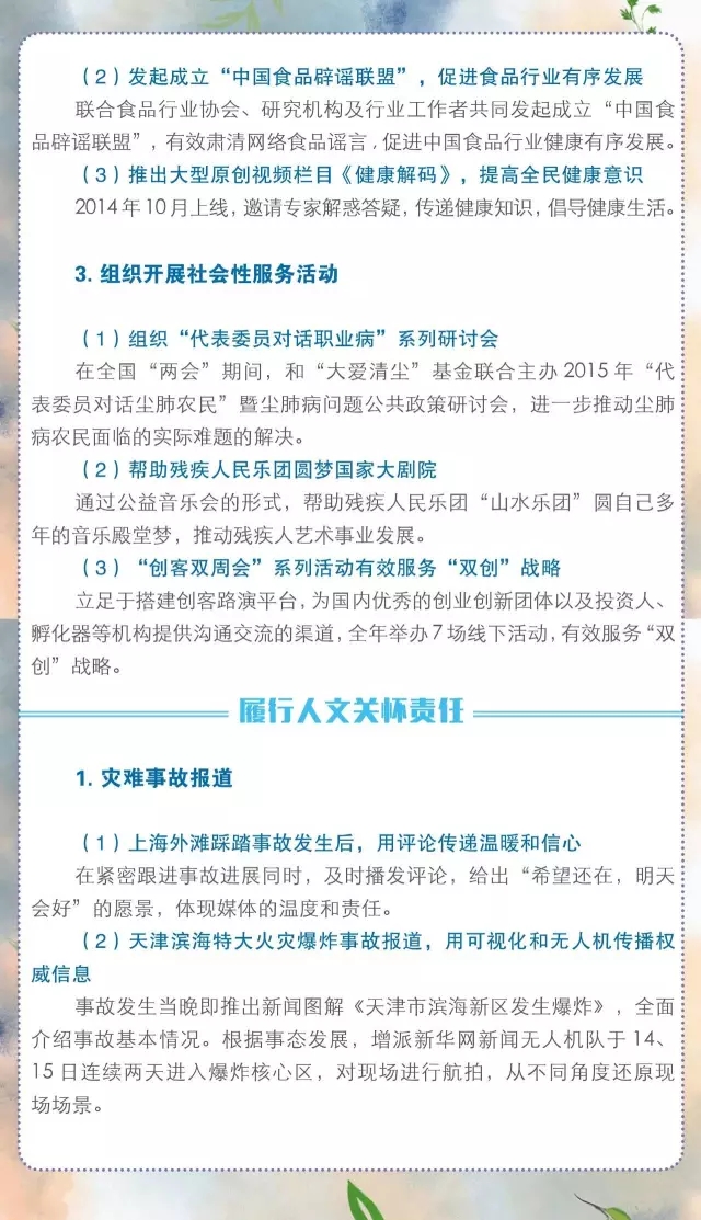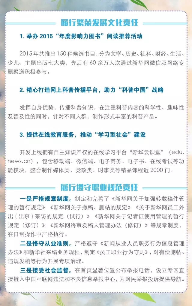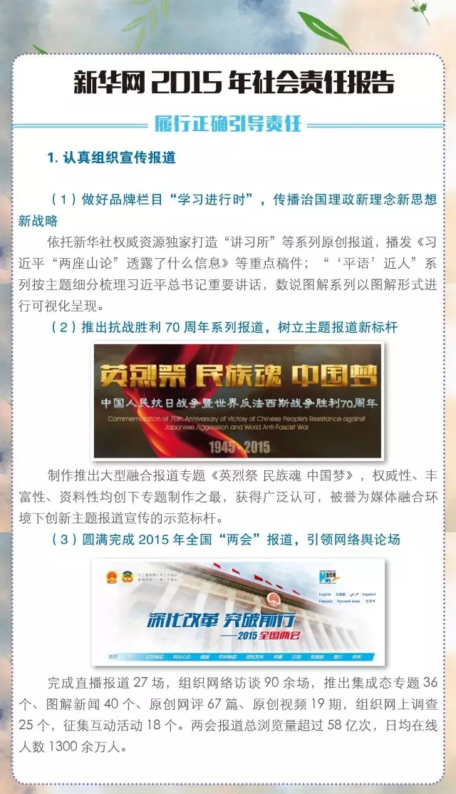 编者按:中国记协网全文发布经济日报、中央电视台、中国青年报、人民网、新华网等38家媒体2015年度社会责任报告,受到各界广泛关注。为了让大家简明扼要地了解各媒体履行社会责任情况,我们以图解的方式陆续推出各媒体社会责任报告的主要内容。