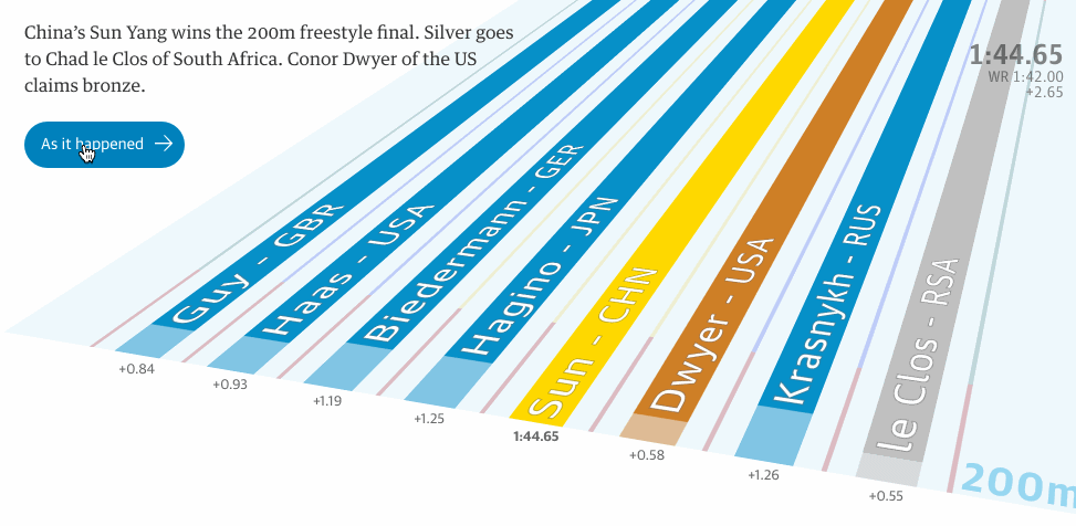 目前在里约的《卫报》数据可视化团队制作了3个可视化产品,内容分别是200米男子自由泳、400米女子自由泳和女子4x100米自由泳接力的数据分析,这些作品同步发布到《卫报》的官网和数据可视化团队的官方Twitter上,引起了很多用户的关注。