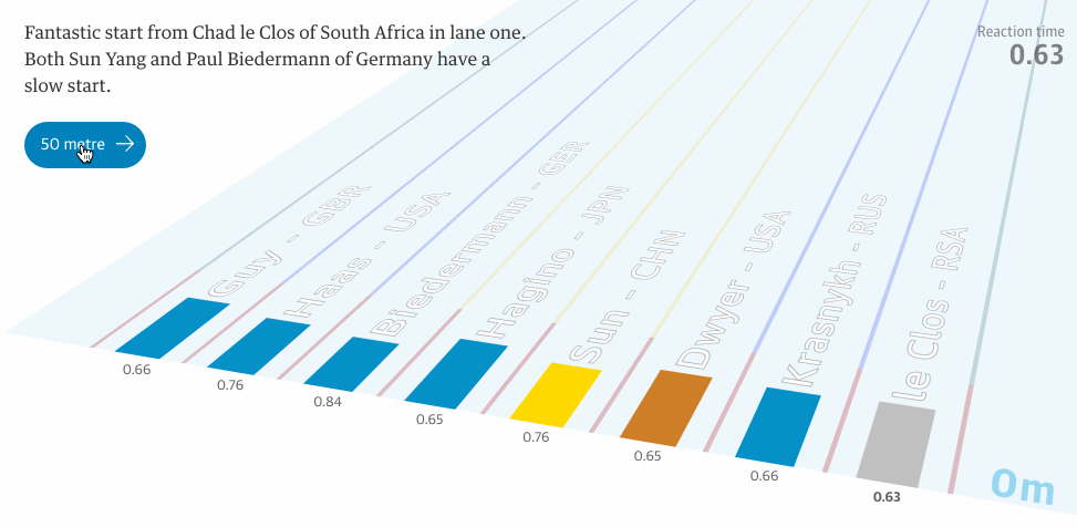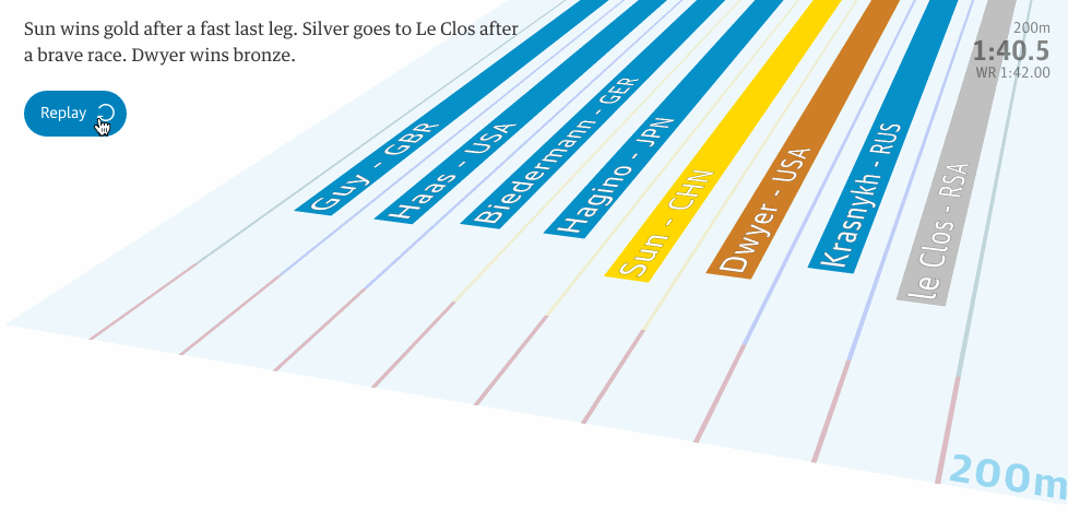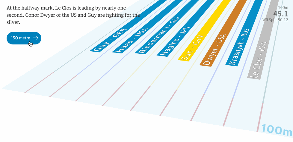 这些作品最精妙的地方在于可以动态展示一个运动员从比赛开始到结束的所有状态数据。比如最近在孙杨打败南非选手查德·勒·克罗斯夺得200米自由泳冠军后,《卫报》数据可视化团队制作了“孙杨在200米自由泳中如何在最后25米翻盘”动态产品,从该团队收集的8位决赛选手的数据,我们能看出其实查德·勒·克罗斯在开局时是最具有优势的。
