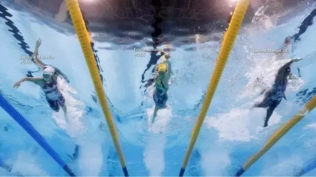 同时,《卫报》数据可视化团队运用了细节图片来展示选手们的运动过程解析,通过使用比赛时的水上和水下照片来分析运动员的运动细节和速度。