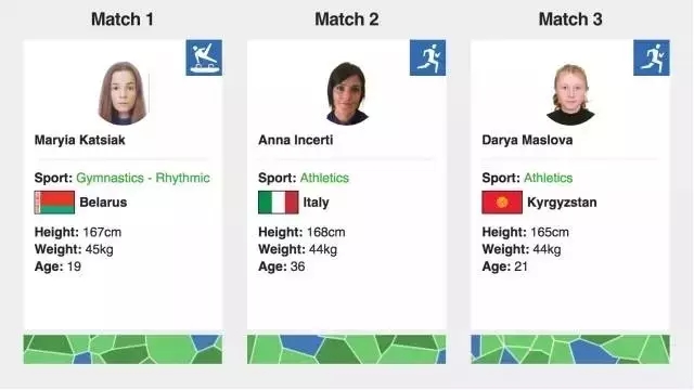 该游戏使用了来自奥运会官方的超过10500名运动员的数据,包括身高、体重还有出生年月日等,用户只要输入身高、体重以及出生年月日等简单信息,就可以找到与自己信息匹配相似的运动员,趣味性十足。