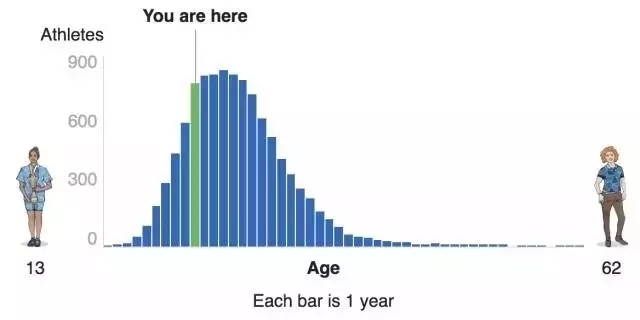不仅如此,他们还将运动员的成绩与每个金牌和世界纪录保持者做对比,做出数据可视化作品,通过宏观的比赛成绩数据,让人们更直接了解该运动员的综合水平。