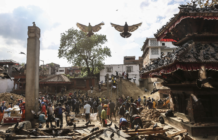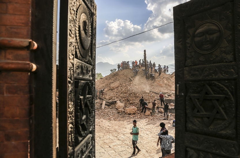2015年5月2日,尼泊尔加德满都,尼泊尔军警和志愿者正在清理被地震摧毁的Kalmochan temple,该寺庙有两千多年历史,地震中被摧毁。