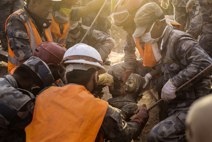 5月3日,尼泊尔军警和志愿者从被地震摧毁的一座有着两千多年历史的寺庙中挖出佛像。