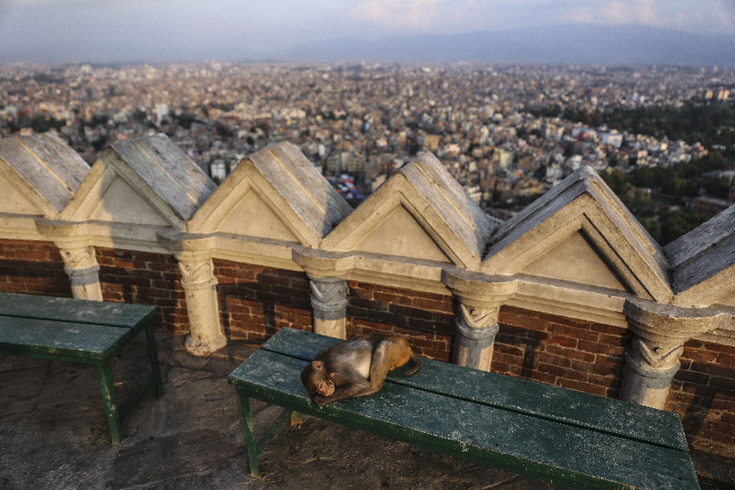 2015年4月30日,尼泊尔加德满都,损毁严重的斯瓦扬布纳寺(猴庙)上的猴子显得很伤心,斯瓦扬布纳寺(猴庙)是尼泊尔历史最为悠久的遗迹也是重要的佛教朝圣地,在8.1级大地震中加德满都很多古建筑被毁。