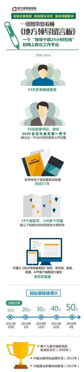 一晃10年,中国网民数量已过7亿,互联网当仁不让地成为群众意见表达的最大平台,成为群众热点难点问题的集散地。网民在《地方领导留言板》上留言累计达93万多条,获得领导干部回复的数量已过57万,超过留言总量的六成。