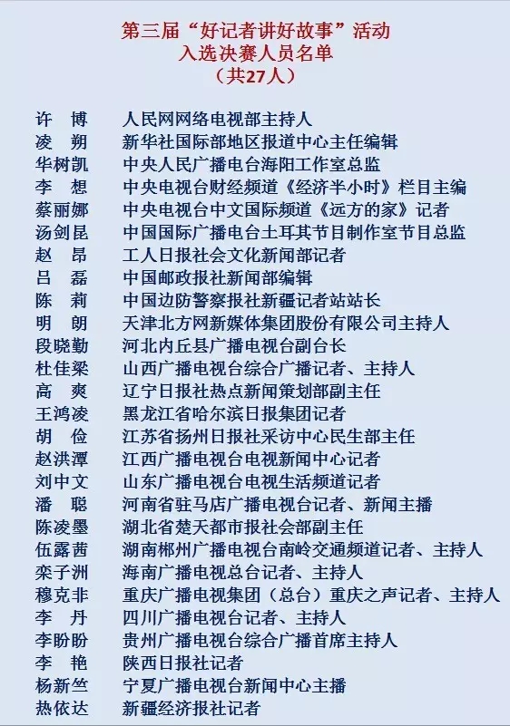 9月19日至22日,第三届 “好记者讲好故事”活动选拔赛复赛在京举行,27名演讲人入围决赛候选名单,现向社会公示。