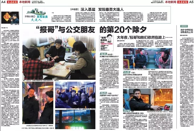 在大连的很多基层单位、街道里巷、工厂乡村,大家都亲切地称他“报哥”。在众多的朋友中,公交战线上的兄弟最多,调度员、司机师傅,提起他,都能讲上不少故事。事实上,从成为新闻记者那年起,除了中间有3年回山东老家过年,其余的20年除夕夜,“报哥”都是与公交职工一起度过的。他的相机记录了无数除夕夜的末班车,定格了无数公交战线普通职工的身影。所以,在“发现最美大连人”开栏之际,“发现”的首位“最美”,就是大连晚报社的记者。