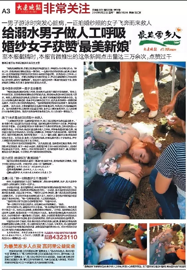 “最美新娘”郭嫄嫄的事迹极具代表性。当时,郭嫄嫄正在海边拍婚纱照,听到有人落水的呼救,不顾妆容,飞奔到海边救人。整整20分钟的按压、人工呼吸,虽然没把人救回来,准新娘的善举却迅速传播开来,网友点赞超过十万。她还从这件事中还发现了普遍性问题——人们对于急救知识的馈乏。为此,她所在的医院组织并成立了心肺复苏培训团队,进社区、进工厂、去学校,把急救知识教给更多人。经过晚报的跟踪采访,郭嫄嫄的事迹迅速传播开来,成为全国性“最美”人物,并被大连市文明办评为“大连好人”,将大连的好人形象推向了全国。