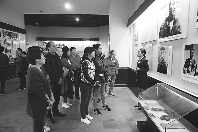10月9日,人民日报、新华社、光明日报等20多家新闻媒体的30多名记者重走长征路至四川省巴中市,图为记者们在刘伯坚烈士纪念馆采访。光明日报记者郭俊锋摄/光明图片