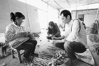 光明日报记者刘坤(右一)在云南省寻甸县花卉种植基地采访。