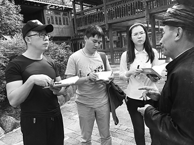 光明日报记者吕慎(左一)、陈海波(左二)在贵州省黎平县肇兴侗寨采访。