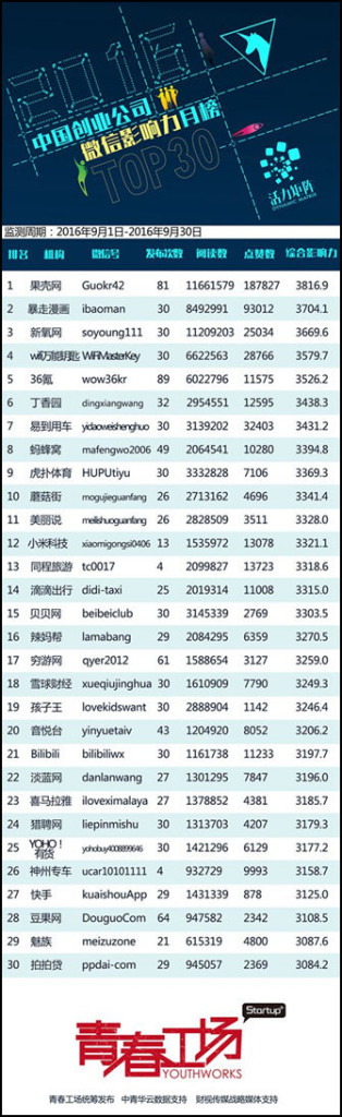 据该榜单发布方青春工场咨询机构介绍,该榜以第三方机构艾瑞咨询发布的2016年中国独角兽企业估值排行榜中的前300家创业公司为样本,对其微信、微博、官网三个数据指标进行了监测,并通过大数据分析,总结传播规律,排出了创业公司新媒体影响力9月数据榜单。据发布方介绍,该榜单的发布意义是期望能对广大创业公司自媒体运营起到大数据分析、支持与参考的作用。