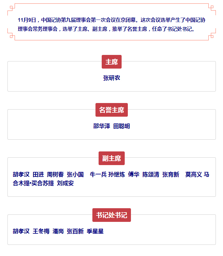 中国记协第九届理事会主席、名誉主席、副主席、书记处书记名单