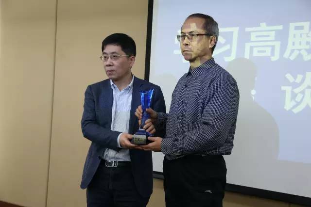座谈会上,中国体育新闻工作者协会向高殿民颁发了纪念奖杯,新华社体育部代为受领