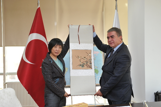 中国新闻代表团团长缪毅容(左)向土耳其总理府新闻署枚赫枚特·阿卡尔卡署长(右)赠送礼品 张炳顺 摄
