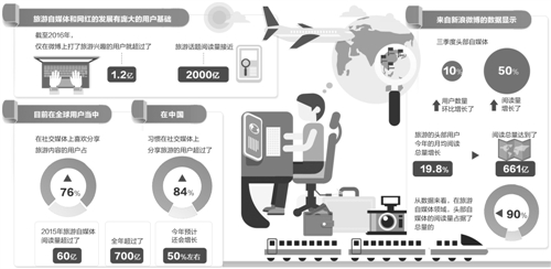 “旅游自媒体和网红的发展有庞大的用户基础。截至2016年,仅在微博上打了旅游兴趣的用户就超过1.2亿,旅游话题阅读量接近2000亿。”微博生活及旅游事业部总经理刘奇认为,这些规模庞大的用户除了消费旅游内容,也在不断增加对旅游内容的生产和发布。