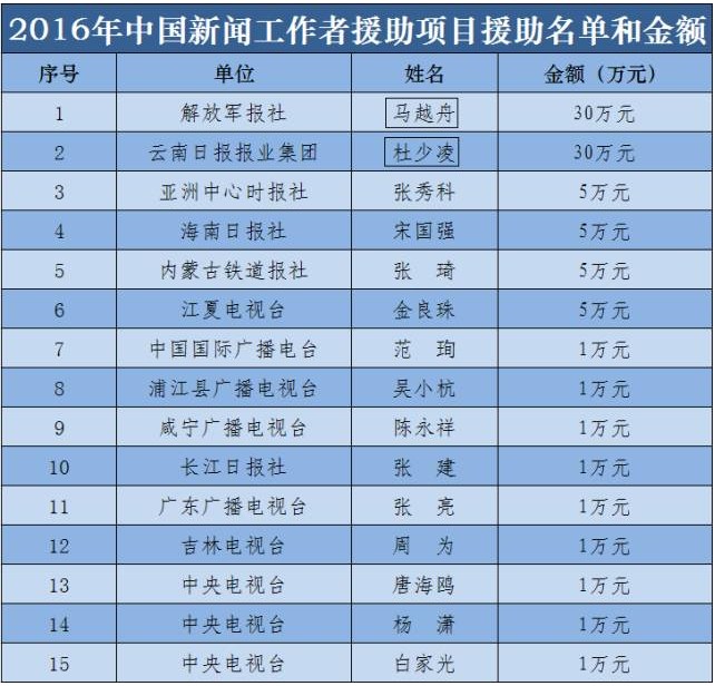 今年11月30日,中国记协正式发布2016年中国新闻工作者援助项目援助名单和金额,解放军报社编辑马越舟等15名新闻工作者获得援助。