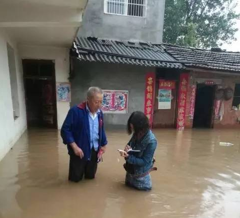 襄阳晚报记者肖梦阳(右)在抗洪救灾现场采访