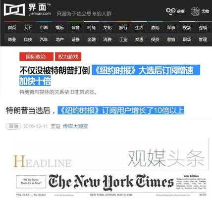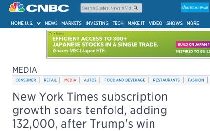 笔者带着问题,从国外网站中搜到了CNBC的一条报道,标题为“New York Times subscription growth soars tenfold, adding 132,000, after Trump's win”。根据《纽约时报》给CNBC的独家信息——从11月8日的大选投票日到上周六(11月26日),时报新闻产品的付费订阅用户净增了约13.2万。报道随后引用总裁马克·汤普森的话,“和一年前同期相比,这是一个急剧的增长水平,10倍。”
