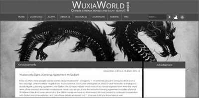 “武侠世界(www.wuxiaworld.com)”是目前英文世界最大的中国网络文学网站,内容以玄幻、武侠、仙侠为主。截至今年11月,“武侠世界”在全世界网站点击率排行榜上竟然排到了第1536名,日均页面访问量达362万次。读者来自全球近百个国家和地区,其中来自美国的读者占了近1/3,其余大都来自菲律宾、印度尼西亚、加拿大和德国。到2016年6月底,武侠世界上已拥有两部翻译完毕的中国长篇网络小说——我吃西红柿的《盘龙》和《星辰变》,以及正在翻译之中的18部中国网络小说。