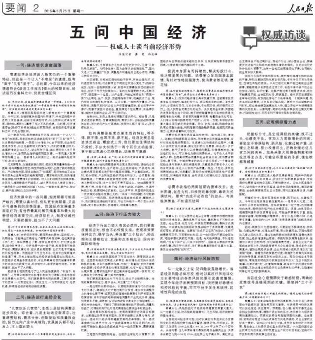 2015年5月,人民日报推出权威人士独家访谈《五问中国经济》。这篇报道一炮打响,成为主流媒体经济形势报道主动发声、引导舆论的一次成功尝试。报道刊发后,“权威人士”一词持续引爆社会舆论场。