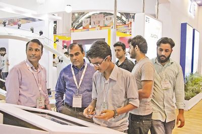 去年10月,在印度首都新德里举行的金砖国家贸易博览会上,观众在展位前测试移动互联网络。记者 苑基荣摄