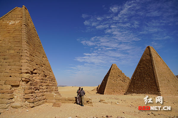 当地时间27日,代表团从北方州返回喀土穆的途中,访问了一处叫做巴格拉维亚的村落,参观了一片由220座金字塔组成的金字塔群,即苏丹历史上著名的麦罗埃王朝的陵墓群,也被称为“小金字塔”。