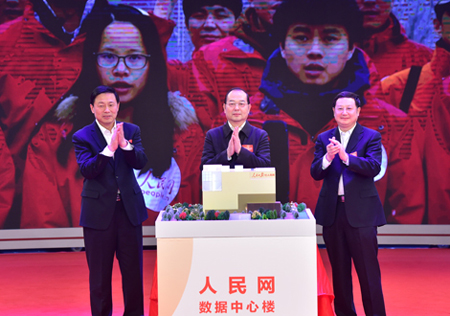 人民日报社社长杨振武(中),中宣部部务会议成员、国务院新闻办副主任郭卫民(左),中国记协党组书记、常务副主席胡孝汉(右)共同为人民网数据中心大楼正式建成启用揭幕