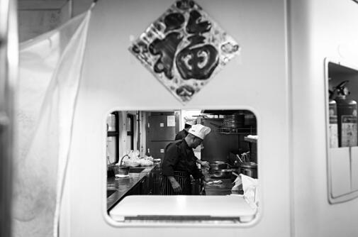 从杭州开往北京的Z10次列车上,厨师长白振庆做开车前准备。沈湜 摄