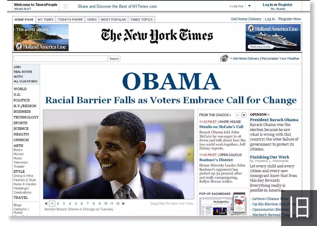 其实《纽约时报》在可视化上吃亏已经不是一两次了,由于传统媒体固有的保守思想,使得《纽约时报》直到2014年才进行了网站版面设计更新,要知道在此之前的最近一次的更新已是2006年,旧网站设计陈旧混乱,流量下滑严重,版面效果可想而知。更新后的网站的设计以简洁风格为主,并更加重视移动端的显示效果,文字大片留白、使用大尺寸图片、视频等多媒体元素是其主要特征。
