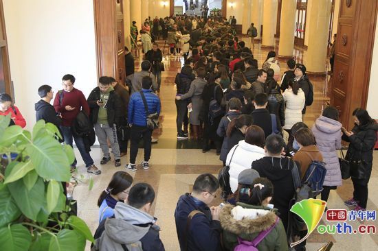 3月1日,全国政协十二届五次会议记者通气会召开。会后,众多记者在全国政协礼堂大厅内排队领取记者证。 中国青年网记者 吴楚 摄