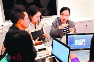 广州日报全媒体记者王菁(右一)在人民日报“中央厨房”与同行进行“头脑风暴”。 广州日报全媒体记者骆昌威、黎旭阳 摄