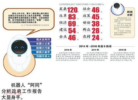 政协大会开幕当天,“阿同”大显身手,瞬间就梳理完了政协工作报告,发现“发展”和“建设”连续四年排在热词榜前列。“阿同”就此一发不可收拾,连续写出了政府工作报告热词分析、外交部部长记者会热点问题分析等多篇报道,让新闻生产进入人工智能时代。