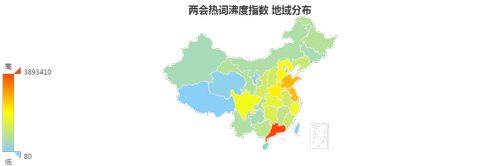 两会舆情“全景地图”显示,以全国不同省份为单位,各区域对两会相关文章的阅读数、阅读时长、喜好程度更有不同,各具特点。