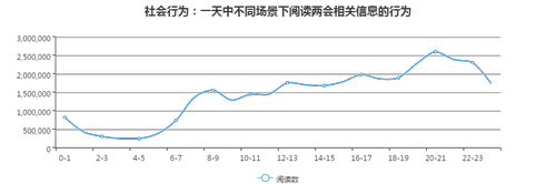 另外,基于对24小时内网民阅读行为追踪分析,发现睡前、通勤、午饭是重要的阅读时间。此次两会,消息阅读最高峰出现在晚间21点左右。晚间个人一般有自由度较高的阅读时间,适合较为深入的或总结性的政治新闻阅读,也适合热点事件的关注和讨论。8点左右,即上班通勤时期;13点左右,即午休时期;17点左右,即下班晚通勤时期,这3个时间节点也是网民阅读的集中时间段。