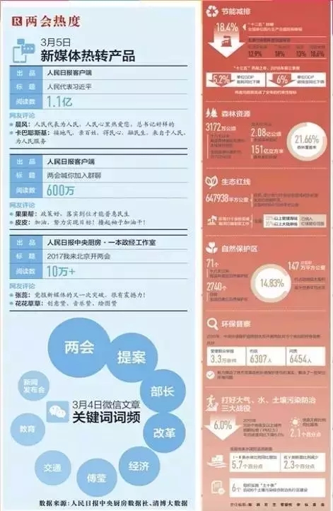 在3月3日和3月6日的人民日报两会特刊中分别刊登了由“数据社”和贵阳大数据交易所、清博大数据公司联合发布的《数读:绿色发展》及《两会舆情排行榜》。充分展现了两家大数据公司在舆情和数据整合的优势,给后续媒体对两会报道的“发力点”及数据呈现形式指明方向。