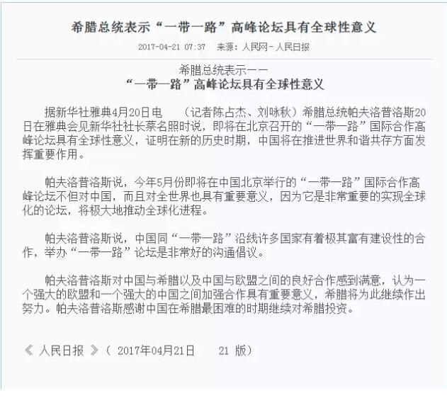 不仅仅是外媒,“一带一路”国际合作高峰论坛还收获了沿线国家领导人的点赞。4月21日,人民网发表题为《希腊总统表示——“一带一路”高峰论坛具有全球性意义》的文章,转述了希腊总统对高峰论坛的期待和对“一带一路”的认可。在文中,希腊总统帕夫洛普洛斯这样点赞高峰论坛:即将在北京召开的“一带一路”国际合作高峰论坛具有全球性意义,证明在新的历史时期,中国将在推进世界和谐共存方面发挥重要作用。