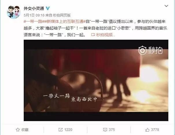 从5月1日开始,一篇名为《外交官都在单曲循环这首歌》的微信公号文章在朋友圈火了。这条由外交部官方微信“外交小灵通”发布的公号文章里有一个短视频MV,歌曲是由在中国工作多年的老挝专家维莱鹏创作,由老挝摇滚乐队主唱阿提萨·拉达那冯演唱。在MV中,老挝街上的男女老少一起面带笑容,点赞“一带一路”。MV发布会点击量很快达到了3.5万之多,网友在下面纷纷给出自己的评论。网名为“石南根”的网友建议:“让歌手出英文版吧,火遍全球。”网友“寒夜”感叹:“听起来真亲切。”网友“春暖花开”则送出祝福:“祝福‘一带一路’上的各国人民都幸福。”